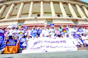 ਨਵੀਂ ਦਿੱਲੀ : ਆਪੋਜ਼ੀਸ਼ਨ ਪਾਰਟੀਆਂ ਦੇ ਕਈ ਆਗੂਆਂ ਨੇ ਮਨੀਪੁਰ ਬਾਰੇ ਸੰਸਦ ਦੇ ਦੋਵਾਂ ਸਦਨਾਂ ’ਚ ਪ੍ਰਧਾਨ ਮੰਤਰੀ ਨਰਿੰਦਰ ਮੋਦੀ ਨੂੰ ਬਿਆਨ ਦੇਣ ਲਈ ਮਜਬੂਰ ਕਰਨ ਵਾਸਤੇ ਸੋਮਵਾਰ ਪਾਰਲੀਮੈਂਟ ਕੰਪਲੈਕਸ ’ਚ ਪ੍ਰੋਟੈੱਸਟ ਕੀਤਾ। ਮਹਾਤਮਾ ਗਾਂਧੀ ਦੇ ਬੁੱਤ ਅੱਗੇ ਪ੍ਰਦਰਸ਼ਨ ਦੌਰਾਨ ਉਨ੍ਹਾਂ ਸਰਕਾਰ ਖਿਲਾਫ ਨਾਅਰੇ ਲਾਏ। ਉਨ੍ਹਾਂ ਬੈਨਰ ਚੁੱਕੇ ਹੋਏ ਸਨ, ਜਿਨ੍ਹਾਂ ਵਿਚ ਲਿਖਿਆ ਹੋਇਆ ਸੀਇੰਡੀਆ ਮਨੀਪੁਰ ਦਾ ਹਾਮੀ ਅਤੇ ਇੰਡੀਆ ਵੱਲੋਂ ਮਨੀਪੁਰ ਬਾਰੇ ਪੀ ਐੱਮ ਦੇ ਬਿਆਨ ਦੀ ਮੰਗ।