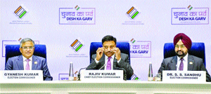 ਨਵੀਂ ਦਿੱਲੀ : 543 ਮੈਂਬਰੀ ਲੋਕ ਸਭਾ ਲਈ ਚੋਣਾਂ ਪਿਛਲੀਆਂ ਚੋਣਾਂ ਵਾਂਗ 7 ਗੇੜਾਂ ’ਚ ਹੋਣਗੀਆਂ। ਪਹਿਲੇ ਗੇੜ ਵਿਚ 19 ਅਪਰੈਲ ਨੂੰ ਵੋਟਾਂ ਪੈਣਗੀਆਂ। 26 ਅਪਰੈਲ ਨੂੰ ਦੂਜੇ ਗੇੜ, 7, 13, 20 ਤੇ 25 ਮਈ ਅਤੇ ਪਹਿਲੀ ਜੂਨ ਨੂੰ ਕ੍ਰਮਵਾਰ ਤੀਜੇ, ਚੌਥੇ, ਪੰਜਵੇਂ, ਛੇਵੇਂ ਤੇ ਸੱਤਵੇਂ ਗੇੜ ਲਈ ਵੋਟਾਂ ਪੈਣਗੀਆਂ। ਪੰਜਾਬ ’ਚ ਆਖਰੀ ਗੇੜ ’ਚ ਵੋਟਾਂ ਪੈਣਗੀਆਂ। ਵੋਟਾਂ ਦੀ ਗਿਣਤੀ 4 ਜੂਨ ਨੂੰ ਹੋਵੇਗੀ। ਚੋਣ ਤਰੀਕਾਂ ਦਾ ਐਲਾਨ ਮੁੱਖ ਚੋਣ ਕਮਿਸ਼ਨਰ ਰਾਜੀਵ ਕੁਮਾਰ ਨੇ ਸ਼ਨੀਵਾਰ ਕੀਤਾ। ਉਨ੍ਹਾ ਨਾਲ ਨਵੇਂ ਨਿਯੁਕਤ ਚੋਣ ਕਮਿਸ਼ਨਰ ਡਾ. ਸੁਖਬੀਰ ਸਿੰਘ ਸੰਧੂ ਤੇ ਗਿਆਨੇਸ਼ ਕੁਮਾਰ ਵੀ ਮੌਜੂਦ ਸਨ। ਚੋਣਾਂ ਦੇ ਐਲਾਨ ਦੇ ਨਾਲ ਹੀ ਦੇਸ਼ ’ਚ ਆਦਰਸ਼ ਚੋਣ ਜ਼ਾਬਤਾ ਲਾਗੂ ਹੋ ਗਿਆ। ਮੁੱਖ ਚੋਣ ਕਮਿਸ਼ਨਰ ਨੇ ਦੱਸਿਆ ਕਿ ਦੇਸ਼ ’ਚ ਕਰੀਬ 97 ਕਰੋੜ ਰਜਿਸਟਰਡ ਵੋਟਰ ਹਨ। ਇਨ੍ਹਾਂ ’ਚ 47.1 ਕਰੋੜ ਮਹਿਲਾ ਵੋਟਰ ਹਨ। 10.5 ਲੱਖ ਤੋਂ ਵੱਧ ਪੋਲਿੰਗ ਸਟੇਸ਼ਨਾਂ ਵਿਚ 55 ਲੱਖ ਈ ਵੀ ਐੱਮ ਦੀ ਵਰਤੋਂ ਹੋਵੇਗੀ। ਪਹਿਲੇ ਗੇੜ ਲਈ 102 ਸੀਟਾਂ, ਦੂਜੇ ਗੇੜ ’ਚ 89 ਸੀਟਾਂ, ਤੀਜੇ ਗੇੜ ’ਚ 94 ਸੀਟਾਂ, ਚੌਥੇ ਗੇੜ ’ਚ 96 ਸੀਟਾਂ, ਪੰਜਵੇਂ ਗੇੜ ’ਚ 49 ਸੀਟਾਂ, ਛੇਵੇਂ ਗੇੜ ’ਚ 57 ਸੀਟਾਂ ਤੇ ਸੱਤਵੇਂ ਗੇੜ ’ਚ 57 ਸੀਟਾਂ ’ਤੇ ਵੋਟਾਂ ਪੈਣਗੀਆਂ।