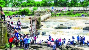 ਪੁਣੇ : ਐਤਵਾਰ ਇੰਦਰਾਯਣੀ ਨਦੀ ’ਤੇ ਬਣਿਆ ਲੋਹੇ ਦਾ ਪੁਲ ਢਹਿਣ ਕਾਰਨ ਕਈ ਨਿੱਕੇ ਬੱਚਿਆਂ ਸਣੇ 25-30 ਸੈਲਾਨੀਆਂ ਦੇ ਵਹਿ ਜਾਣ ਦਾ ਖਦਸ਼ਾ ਹੈ। ਪੁਲ ਢਹਿਣ ਵੇਲੇ ਸੈਲਾਨੀ ਸੈਲਫੀਆਂ ਲੈ ਰਹੇ ਸਨ। ਸਥਾਨਕ ਵਿਧਾਇਕ ਸੁਨੀਲ ਸ਼ੇਲਕੇ ਨੇ ਦੱਸਿਆ ਕਿ ਛੇ ਮੌਤਾਂ ਦੀ ਪੁਸ਼ਟੀ ਹੋਈ ਹੈ। ਇਹ ਘਟਨਾ ਕੁੰਡਮਾਲਾ ਵਿੱਚ ਵਾਪਰੀ, ਜੋ ਕਿ ਇੱਕ ਪ੍ਰਸਿੱਧ ਸੈਰ-ਸਪਾਟਾ ਸਥਾਨ ਹੈ, ਜਿੱਥੇ ਮਾਨਸੂਨ ਦੌਰਾਨ ਵੱਡੀ ਗਿਣਤੀ ਵਿੱਚ ਸੈਲਾਨੀ ਆਉਂਦੇ ਹਨ। ਪਿਛਲੇ ਦੋ ਦਿਨਾਂ ਤੋਂ ਇਲਾਕੇ ਵਿੱਚ ਭਾਰੀ ਬਾਰਿਸ਼ ਹੋ ਰਹੀ ਸੀ।