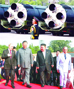 ਬੀਜਿੰਗ : ਚੀਨ ਦੇ ਰਾਸ਼ਟਰਪਤੀ ਸ਼ੀ ਜਿਨਪਿੰਗ ਨੇ ਬੁੱਧਵਾਰ ਦੇਸ਼ ਦੀ ਸਭ ਤੋਂ ਵੱਡੀ ਮਿਲਟਰੀ ਪਰੇਡ ਦੀ ਪ੍ਰਧਾਨਗੀ ਕੀਤੀ। ਰੂਸੀ ਰਾਸ਼ਟਰਪਤੀ ਵਲਾਦੀਮੀਰ ਪੁਤਿਨ ਤੇ ਉੱਤਰੀ ਕੋਰੀਆ ਦੇ ਆਗੂ ਕਿਮ ਜੋਂਗ ਉਨ ਵੀ ਉਨ੍ਹਾ ਦੇ ਨਾਲ ਸਨ। ਇਹ ਪਰੇਡ ਦੂਜੀ ਸੰਸਾਰ ਜੰਗ ਵਿੱਚ ਜਾਪਾਨ ਦੀ ਹਾਰ ਦੀ 80ਵੀਂ ਵਰ੍ਹੇਗੰਢ ਮਨਾਉਣ ਲਈ ਕੀਤੀ ਗਈ।