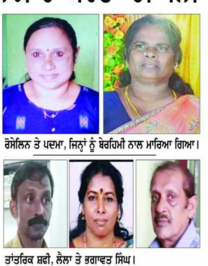 ਕੋਚੀ : ਕੇਰਲ ’ਚ ਕਥਿਤ ਤੌਰ ’ਤੇ ਮਨੁੱਖੀ ਬਲੀ ਦੇ ਇਰਾਦੇ ਨਾਲ ਦੋ ਔਰਤਾਂ ਦੇ ਕਤਲ ਦੇ ਕੇਸ ਦੇ ਤਿੰਨ ਮੁਲਜ਼ਮਾਂ ਮਸਾਜ਼ ਥੈਰੇਪਿਸਟ ਭਗਾਵਤ ਸਿੰਘ, ਉਸ ਦੀ ਪਤਨੀ ਲੈਲਾ ਅਤੇ ਉਨ੍ਹਾਂ ਦੇ ਏਜੰਟ ਤਾਂਤਰਿਕ ਮੁਹੰਮਦ ਸ਼ਫੀ ਨੂੰ ਬੁੱਧਵਾਰ ਸਵੇਰੇ ਅਦਾਲਤ ’ਚ ਪੇਸ਼ ਕੀਤਾ ਗਿਆ। ਅਦਾਲਤ ਨੇ ਉਨ੍ਹਾਂ ਦਾ 26 ਅਕਤੂਬਰ ਤੱਕ ਲਈ ਪੁਲਸ ਰਿਮਾਂਡ ਦੇ ਦਿੱਤਾ।