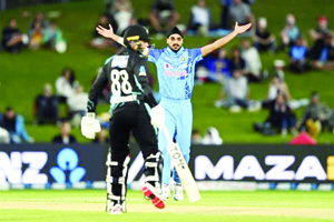 ਨੇਪੀਅਰ : ਭਾਰਤ ਤੇ ਨਿਊ ਜ਼ੀਲੈਂਡ ਵਿਚਾਲੇ ਤੀਜਾ ਅਤੇ ਆਖਰੀ ਟੀ-20 ਕੌਮਾਂਤਰੀ ਮੈਚ ਮੰਗਲਵਾਰ ਇਥੇ ਮੀਂਹ ਕਾਰਨ ਡਕਵਰਥ ਲੂਈਸ ਨਿਯਮ ਤਹਿਤ ਬਰਾਬਰ ਰਿਹਾ | ਭਾਰਤ ਨੇ ਤਿੰਨ ਮੈਚਾਂ ਦੀ ਸੀਰੀਜ਼ 1-0 ਨਾਲ ਜਿੱਤ ਲਈ | ਭਾਰਤੀ ਗੇਂਦਬਾਜ਼ਾਂ ਨੇ ਸ਼ਾਨਦਾਰ ਪ੍ਰਦਰਸ਼ਨ ਕਰਦਿਆਂ ਡੇਵੋਨ ਕੌਨਵੇ (59) ਅਤੇ ਗਲੇਨ ਫਿਲਿਪਸ (54) ਦੇ ਅਰਧ ਸੈਂਕੜਿਆਂ ਦੇ ਬਾਵਜੂਦ ਨਿਊ ਜ਼ੀਲੈਂਡ ਨੂੰ 19.4 ਓਵਰਾਂ ‘ਚ 160 ਦੌੜਾਂ ‘ਤੇ ਆਊਟ ਕਰ ਦਿੱਤਾ | ਮੁਹੰਮਦ ਸਿਰਾਜ ਨੇ 17 ਦੌੜਾਂ ਦੇ ਕੇ ਚਾਰ ਅਤੇ ਅਰਸ਼ਦੀਪ ਸਿੰਘ ਨੇ 37 ਦੌੜਾਂ ਦੇ ਕੇ ਚਾਰ ਵਿਕਟਾਂ ਲਈਆਂ | ਹਰਸ਼ਲ ਪਟੇਲ ਨੂੰ ਇਕ ਵਿਕਟ ਮਿਲੀ | ਮੀਂਹ ਕਾਰਨ ਜਿਸ ਵੇਲੇ ਮੈਚ ਰੋਕਣਾ ਪਿਆ, ਉਸ ਵੇਲੇ ਭਾਰਤ 9 ਓਵਰਾਂ ‘ਚ 4 ਵਿਕਟਾਂ ‘ਤੇ 75 ਦੌੜਾਂ ‘ਤੇ ਸੀ |